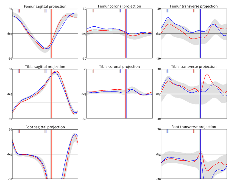 Left-side movements were shown in red, right-side in blue, and normal movement ranges were displayed as an orange band for comparison. This allowed for a clear and structured discussion of potential interventions. The lab was equipped with 16 specialised motion-capture cameras and a pressure-sensitive walkway, providing precise data for surgical planning.