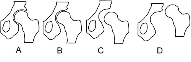 Figure 6: Diagram outlining types of misalignments: Normal, Dysplasia, Subluxation, Luxation.