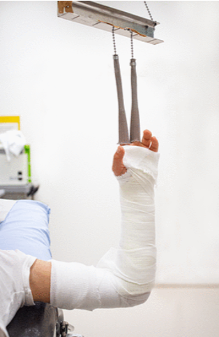 To conclude the day, I spent time in the plaster room with MR, MS, and FR. This team sees a broad range of patients daily, applying and adjusting casts for the entire hospital. The most memorable was a 93-year-old woman (C) who had fractured her right wrist. Given her age, surgical intervention posed more risks than benefits, so the team opted for a clever alternative: a tension-hand setup. Two elastic finger traps suspended her fingers while a 4-kilogram weight was attached to her elbow, gently aligning the bones without invasive treatment.