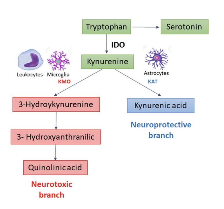 Microglia are resident immune cells in the CNS with a function comparable to guards, screening and sensing nearby inflammatory cues, seated within the brain parenchyma. The versatility of their plasticity allows them to effectively alter their cell morphology in response to such signals. In normal state, a ramified morphology of a small soma is maintained. However, in circumstances where microglial activation may take place such as from peripheral inflammation by systemic lipopolysaccharide (LPS) administration, microglia exhibit a much more aggressive pro-inflammatory phenotype, proved by galectin-3-positive microglia, a disease-associated phenotypic marker for microglia[68]. Immunologically activated microglia can be characterized by an amoeboid morphology, increasing cytokine and ROS production. The function of microglia can equally be affected by the essential amino acid tryptophan mostly metabolized through the kynurenine pathway, where an increase in tryptophan metabolism can be caused by either chronic stress or inflammation. When the rate-limiting enzyme indoleamine-2,3-dioxygenase (IDO) is upregulated, it aids in conversion of tryptophan into kynurenine in microglia upon activation, and several cytokines can upregulate IDO, an event that exists both in the brain or in the periphery. The kynurenine pathway has two main branches which ultimately result in generation of 3-hydroxykynurenine (3-HK), quinolinic acid (QA) via activation of kynurenine 3-monooxygenase (KMO), or conversion into kynurenic acid (KA) (fig.2). 3-HK is a toxic metabolite which can induce oxidative damage, with neuronal damage mediated by free radicals. The neurotoxic effects of the NMDA receptor agonist QA could potentially be modulated by KA, as an antagonist of NMDA receptors with opposing neuroprotective effects. QA is a byproduct of the pathway, produced in microglia, and 3-HK acts as a precursor due to its ability to pass the BBB along with kynurenine and tryptophan. It should be logical to suggest that metabolite imbalance may well contribute to plenty of abnormal behavior relevant to neuropsychiatric diseases.